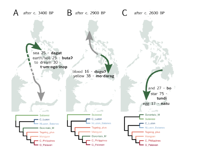 The Philippines are central to understanding the expansion of the Austronesian language family from its homeland in Taiwan. It remains unknown to what extent the distribution of Malayo-Polynesian languages has been shaped by back migrations and language leveling events following the initial Out-of-Taiwan expansion. Other aspects of language history, including the effect of language switching from non-Austronesian languages, also remain poorly understood. Here we apply Bayesian phylogenetic methods to a core-vocabulary dataset of Philippine languages. Our analysis strongly supports a sister group relationship between the Sangiric and Minahasan groups of northern Sulawesi on one hand, and the rest of the Philippine languages on the other, which is incompatible with a simple North-to-South dispersal from Taiwan. We find a pervasive geographical signal in our results, suggesting a dominant role for cultural diffusion in the evolution of Philippine languages. However, we do find some support for a later migration of Gorontalo-Mongondow languages to northern Sulawesi from the Philippines. Subsequent diffusion processes between languages in Sulawesi appear to have led to conflicting data and a highly unstable phylogenetic position for Gorontalo-Mongondow. In the Philippines, language switching to Austronesian in ‘Negrito’ groups appears to have occurred at different time-points throughout the Philippines, and based on our analysis, there is no discernible effect of language switching on the basic vocabulary.