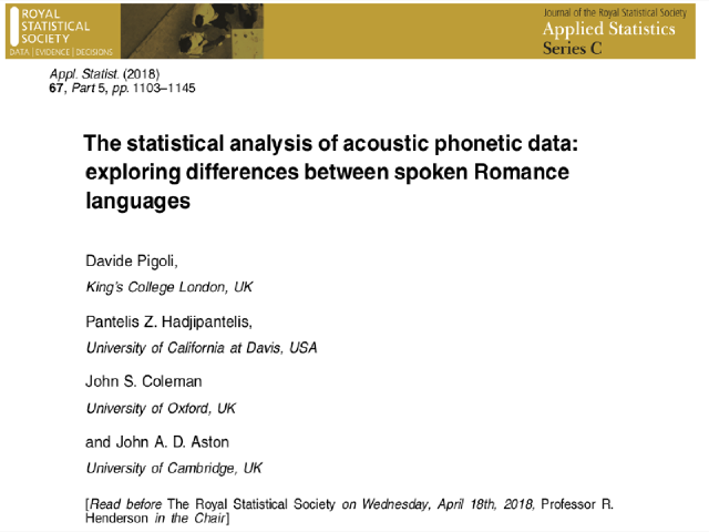 I thank Pigoli et al. for their interesting contribution. One question: have they evaluated the fit of their data onto the family tree of these languages? All the languages analysed are Romance languages, but there are degrees of relatedness within this grouping (e.g. Italian is the most divergent, while Portuguese is closer to Spanish than French). Is this analysis able to correctly identify these nested patterns? Rather than averaging across words, are the authors able to align each word separately in discrete manner and use this to recover phylogeny?