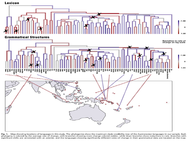 Understanding how and why language subsystems differ in their evolutionary dynamics is a fundamental question for historical and comparative linguistics. One key dynamic is the rate of language change. While it is commonly thought that the rapid rate of change hampers the reconstruction of deep language relationships beyond 6,000–10,000 y, there are suggestions that grammatical structures might retain more signal over time than other subsystems, such as basic vocabulary. In this study, we use a Dirichlet process mixture model to infer the rates of change in lexical and grammatical data from 81 Austronesian languages. We show that, on average, most grammatical features actually change faster than items of basic vocabulary. The grammatical data show less schismogenesis, higher rates of homoplasy, and more bursts of contact-induced change than the basic vocabulary data. However, there is a core of grammatical and lexical features that are highly stable. These findings suggest that different subsystems of language have differing dynamics and that careful, nuanced models of language change will be needed to extract deeper signal from the noise of parallel evolution, areal readaptation, and contact.