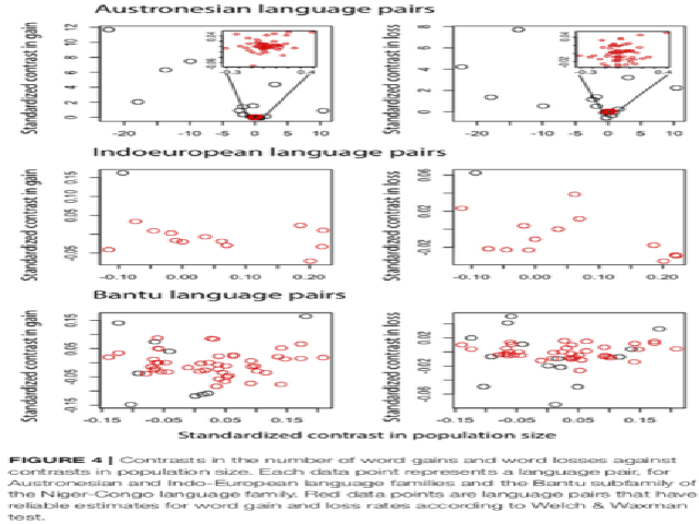 What role does speaker population size play in shaping rates of language evolution? There has been little consensus on the expected relationship between rates and patterns of language change and speaker population size, with some predicting faster rates of change in smaller populations, and others expecting greater change in larger populations. The growth of comparative databases has allowed population size effects to be investigated across a wide range of language groups, with mixed results. One recent study of a group of Polynesian languages revealed greater rates of word gain in larger populations and greater rates of word loss in smaller populations. However, that test was restricted to 20 closely related languages from small Oceanic islands. Here, we test if this pattern is a general feature of language evolution across a larger and more diverse sample of languages from both continental and island populations. We analyzed comparative language data for 153 pairs of closely-related sister languages from three of the world’s largest language families: Austronesian, Indo-European, and Niger-Congo. We find some evidence that rates of word loss are significantly greater in smaller languages for the Indo-European comparisons, but we find no significant patterns in the other two language families. These results suggest either that the influence of population size on rates and patterns of language evolution is not universal, or that it is sufficiently weak that it may be overwhelmed by other influences in some cases. Further investigation, for a greater number of language comparisons and a wider range of language features, may determine which of these explanations holds true.