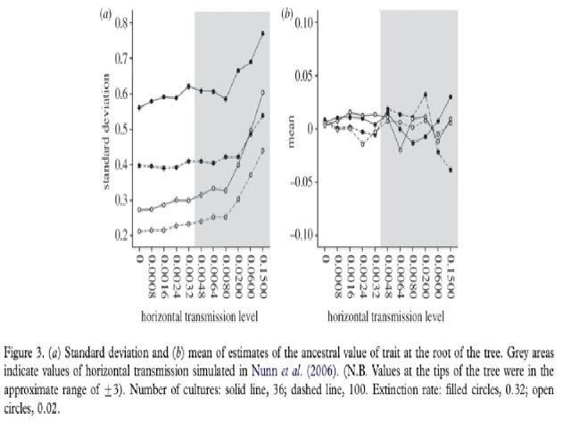 Phylogenetic comparative methods (PCMs) provide a potentially powerful toolkit for testing hypotheses about cultural evolution. Here we build on previous simulation work by Nunn et al. (2006) to assess the effect horizontal transmission between cultures has on the ability of both phylogenetic and non-phylogenetic methods to make inferences about trait evolution. We found that the mode of horizontal transmission of traits has important consequences for both methods. Where traits were horizontally transmitted separately PCMs accurately reported when trait evolution was not correlated even at the highest levels of horizontal transmission. In contrast, linear regression analyses often incorrectly concluded that traits were correlated. Where simulated trait evolution was not correlated and traits were horizontally transmitted as a pair both methods showed increased levels of positive correlation with increasing horizontal transmission. Where simulated trait evolution was correlated increasing rates of separate horizontal transmission led to decreasing levels of correlation for both methods, but that increasing rates of paired horizontal transmission did not. Furthermore, the PCM was also able to make accurate inferences about the ancestral state of traits. These results suggest that under certain conditions PCMs can be robust to the effects of horizontal transmission. We discuss ways that future work can investigate the mode and tempo of horizontal transmission of cultural traits.
