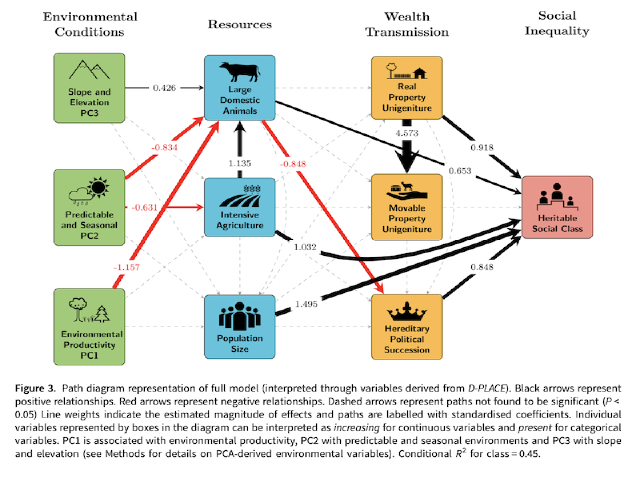 Social inequality is ubiquitous in contemporary human societies, and has deleterious social and ecological impacts. However, the factors that shape the emergence and maintenance of inequality remain widely debated. Here we conduct a global analysis of pathways to inequality by comparing 408 non-industrial societies in the anthropological record (described largely between 1860 and 1960) that vary in degree of inequality. We apply structural equation modelling to open-access environmental and ethnographic data and explore two alternative models varying in the links among factors proposed by prior literature, including environmental conditions, resource intensification, wealth transmission, population size and a well-documented form of inequality: social class hierarchies. We found support for a model in which the probability of social class hierarchies is associated directly with increases in population size, the propensity to use intensive agriculture and domesticated large mammals, unigeniture inheritance of real property and hereditary political succession. We suggest that influence of environmental variables on inequality is mediated by measures of resource intensification, which, in turn, may influence inequality directly or indirectly via effects on wealth transmission variables. Overall, we conclude that in our analysis a complexnetwork of effects are associated with social class hierarchies.