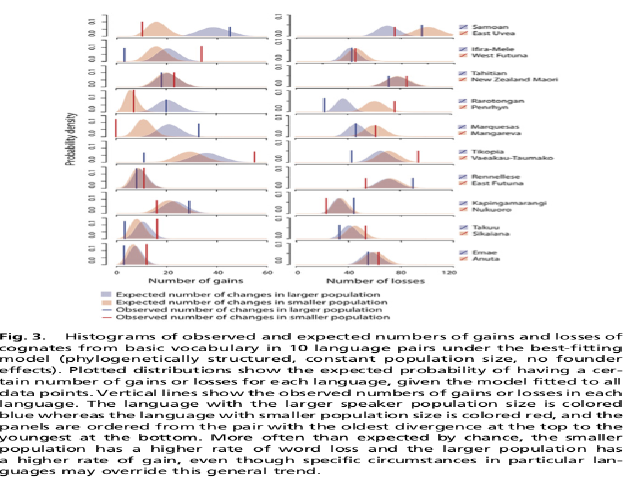 The effect of population size on patterns and rates of language evolution is controversial. Do languages with larger speaker populations change faster due to a greater capacity for innovation, or do smaller populations change faster due to more efficient diffusion of innovations? Do smaller populations suffer greater loss of language elements through founder effects or drift, or do languages with more speakers lose features due to a process of simplification? Revealing the influence of population size on the tempo and mode of language evolution not only will clarify underlying mechanisms of language change but also has practical implications for the way that language data are used to reconstruct the history of human cultures. Here, we provide, to our knowledge, the first empirical, statistically robust test of the influence of population size on rates of language evolution, controlling for the evolutionary history of the populations and formally comparing the fit of different models of language evolution. We compare rates of gain and loss of cognate words for basic vocabulary in Polynesian languages, an ideal test case with a well-defined history. We demonstrate that larger populations have higher rates of gain of new words whereas smaller populations have higher rates of word loss. These results show that demographic factors can influence rates of language evolution and that rates of gain and loss are affected differently. These findings are strikingly consistent with general predictions of evolutionary models.