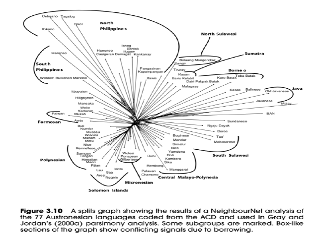 Dispersals have been commonplace throughout the history of genus homo (Templeton 2002). However, it is only recently that scenarios about human population expansions have begun to be studied again after a long period of marginalisation (Anthony 1990; Burmeister 2000 and associated commentaries). Some authors, such as Diamond and Bellwood (2003), have argued that dispersals, especially those linked to the development of agriculture, are the “most important process in Holocene human history” (p 597). Unfortunately, many expansion scenarios are little more than plausible narratives. A common feature of these narratives is the assertion that a particular line of evidence (archaeological, linguistic or genetic) is “consistent with” the scenario. “Consistent with” covers a multitude of sins. Rigorous tests require a measure of exactly how well the data matches the proposed scenario. They also require an explicit evaluation of alternative hypotheses. Perhaps the data are equally “consistent with” many alternative hypotheses. Given the interest in hypotheses about human dispersal scenarios, a framework for the rigorous evaluation of these hypotheses is clearly desirable. Here we describe our attempts to apply a phylogenetic framework to linguistic data in an effort to test one of these scenarios — the Austronesian expansion.