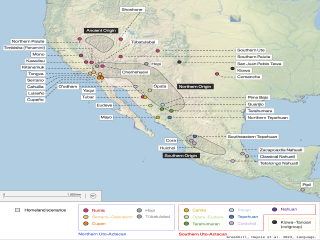 The Uto-Aztecan language family is one of the largest language families in the Americas. However, there has been considerable debate about its origin and how it spread. Here we use Bayesian phylogenetic methods to analyze lexical data from thirty-four Uto-Aztecan varieties and two Kiowa-Tanoan languages. We infer the age of Proto-Uto-Aztecan to be around 4,100 years (3,258–5,025 years) and identify the most likely homeland to be near what is now Southern California. We reconstruct the most probable subsistence strategy in the ancestral Uto-Aztecan society and infer no casual or intensive cultivation, an absence of cereal crops, and a primary subsistence mode of gathering (rather than agriculture). Our results therefore support the timing, geography, and cultural practices of a northern origin and are inconsistent with alternative scenarios.