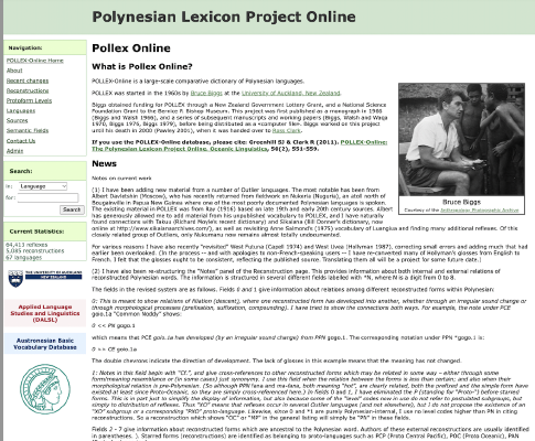 The Polynesian lexicon project, POLLEX, was initiated in 1965 by Bruce Biggs in order to provide a large-scale comparative dictionary of Polynesian languages. Since then, POLLEX has grown to include over 55,000 reflexes of more than 4,700 reconstructed forms in 68 languages. These data have enabled many fundamental advances in Polynesian linguistics and prehistory. At almost half a century old, POLLEX is one of the longest-standing databases of linguistic information, and has moved through various incarnations, from type-writer and edge-punched cards, through microfiche to mainframe computer. …